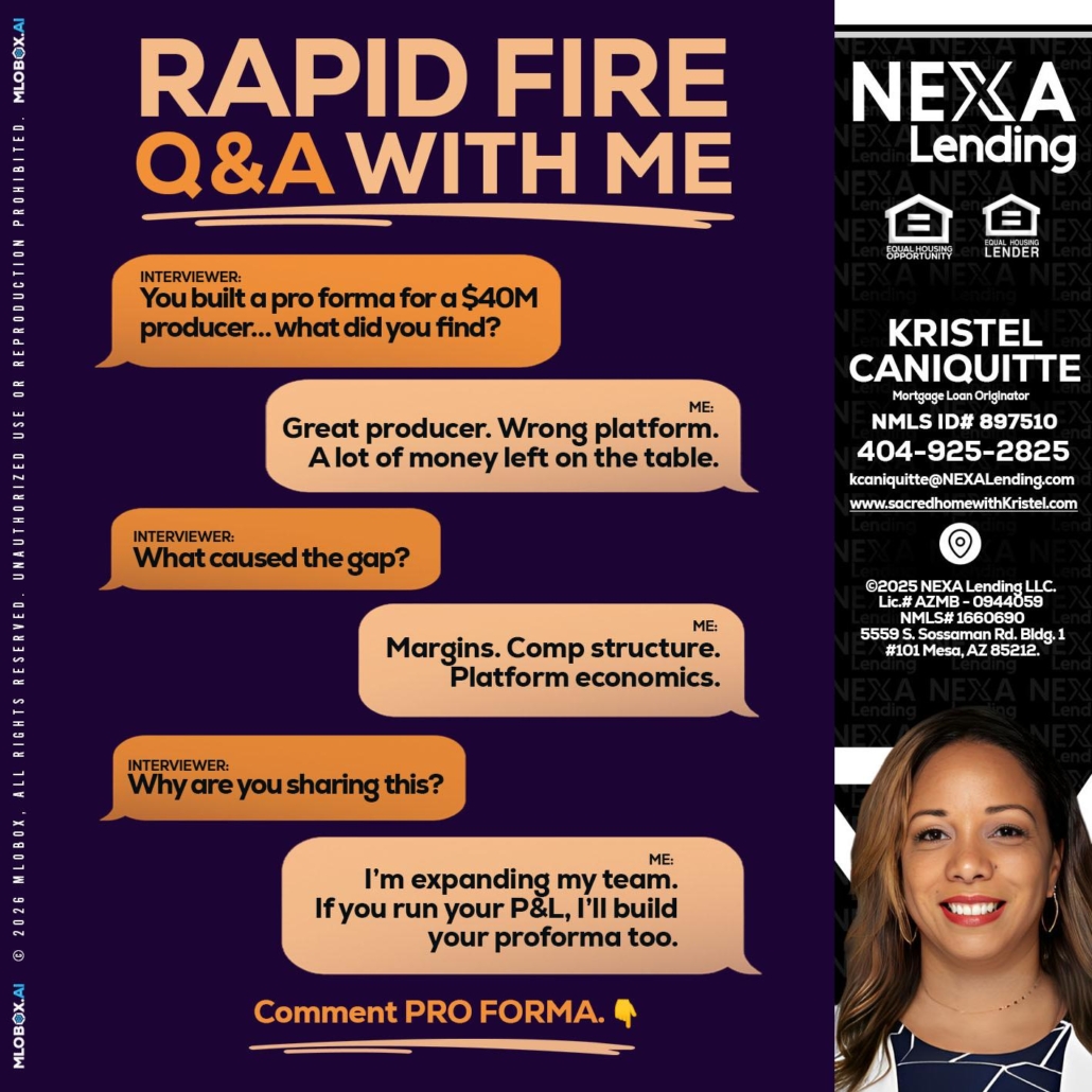 RAPID FIRE - Kristel Caniquitte -Mortgage Loan OriginatorHi, my name is Kristel Caniquitte. I’m a Loan Officer with NEXA Lending LLC., offering personalized mortgage solutions, fast customized quotes, great rates and service with integrity.