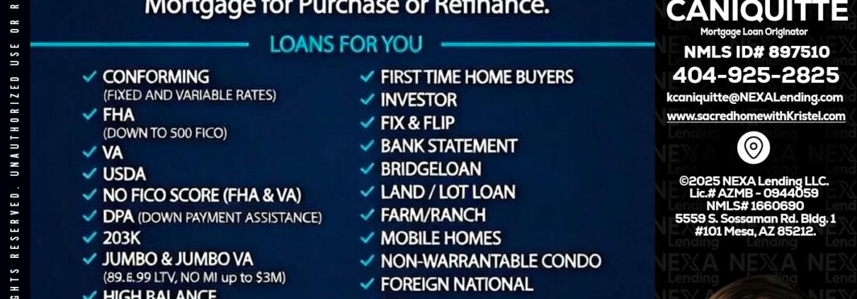 we shop 300 + lenders - Kristel Caniquitte -Mortgage Loan OriginatorHi, my name is Kristel Caniquitte. I’m a Loan Officer with NEXA Lending LLC., offering personalized mortgage solutions, fast customized quotes, great rates and service with integrity.